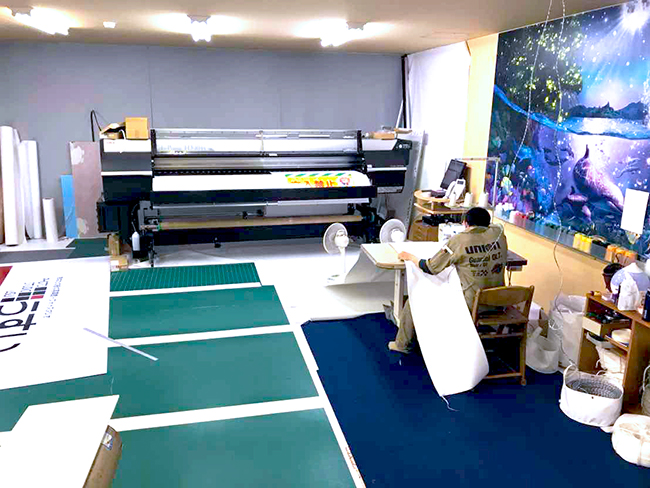 レーザーカッター、マルチカッター、溶剤・水性・UVインクジェットプリンター、ラミネーターと充実した設備を保有されており、特にすぐに導入が難しい大型の加工機を使った出力サービスをご提供されています。