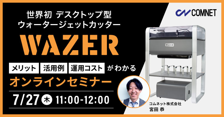 コムネット株式会社は、2023年7月27日(木)に「ウォータージェットカッター「WAZER」のメリット・活用例・運用コストがわかるオンラインセミナー」を開催いたします。