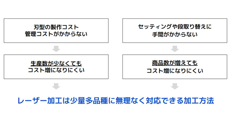 生産数が少なくても、段取り替えが多くても、手間やコストがかかりにくいため、少量多品種(小ロット多品種)へ無理なく対応できる加工方法といえます。